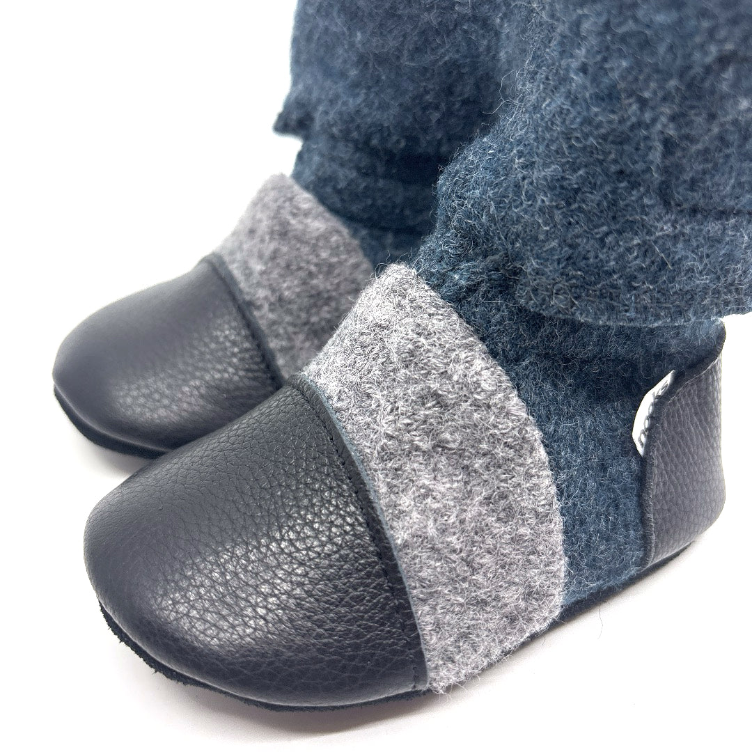 The dark heather blue wool body of the booties has been paired with neutral heather grey wool uppers and black leather toe and heel caps for a timeless look.
