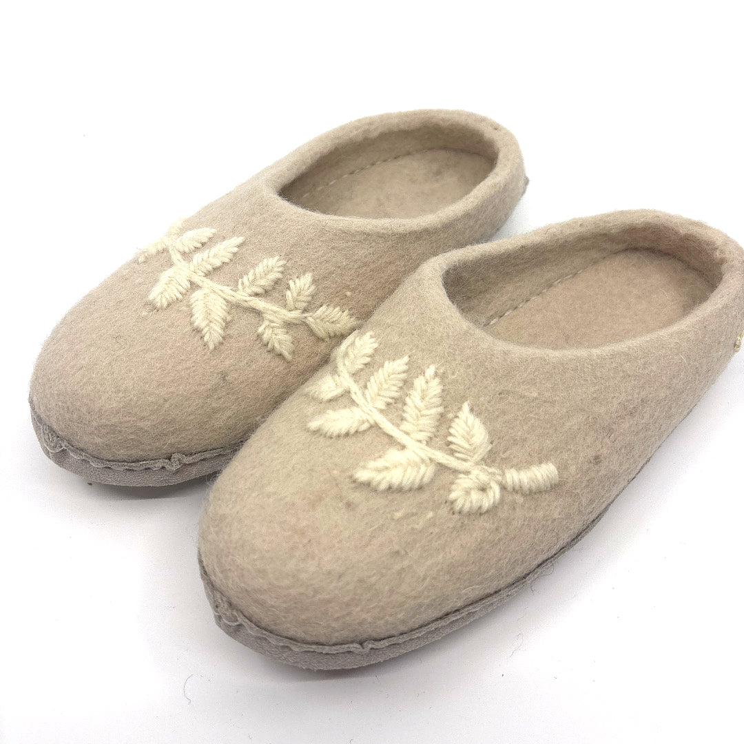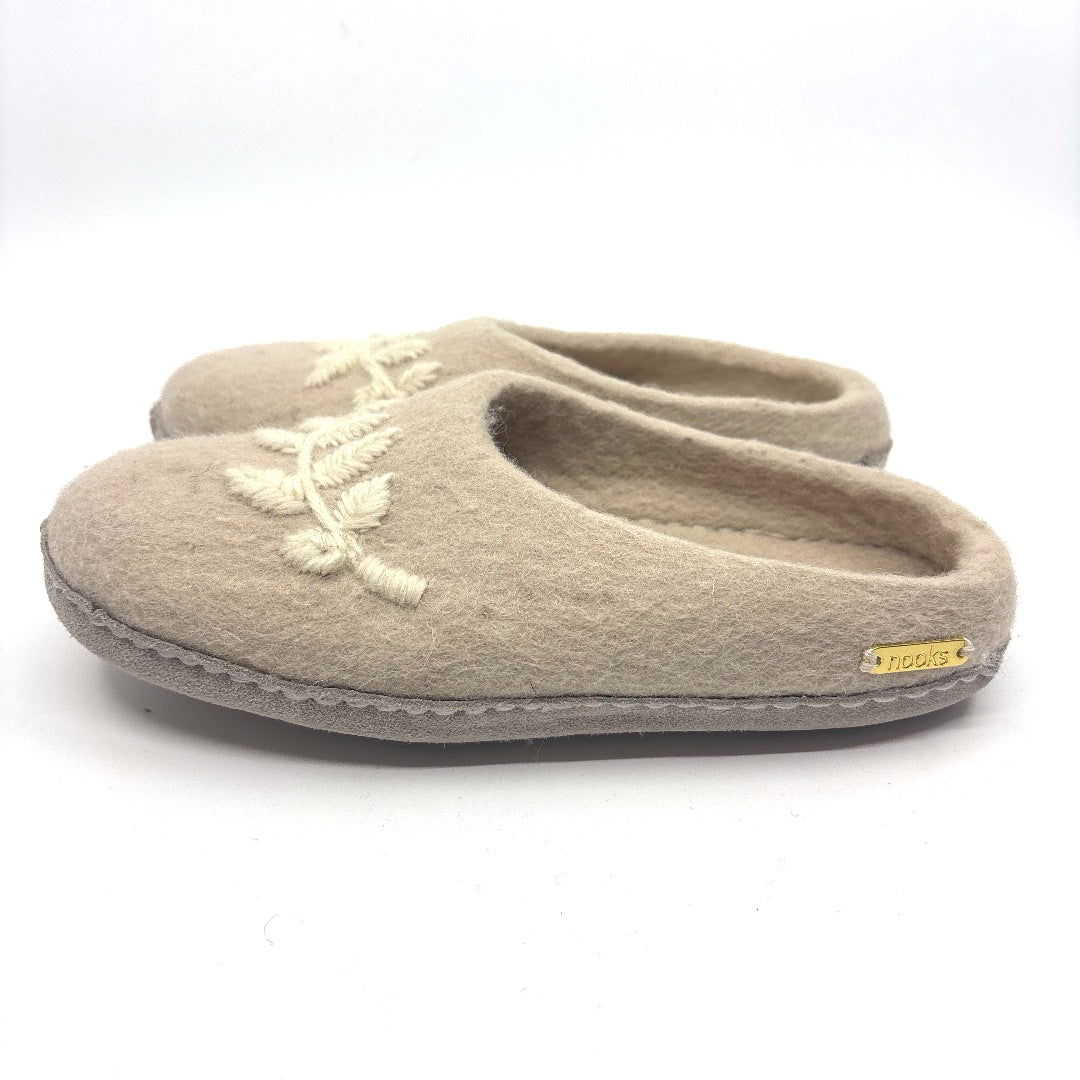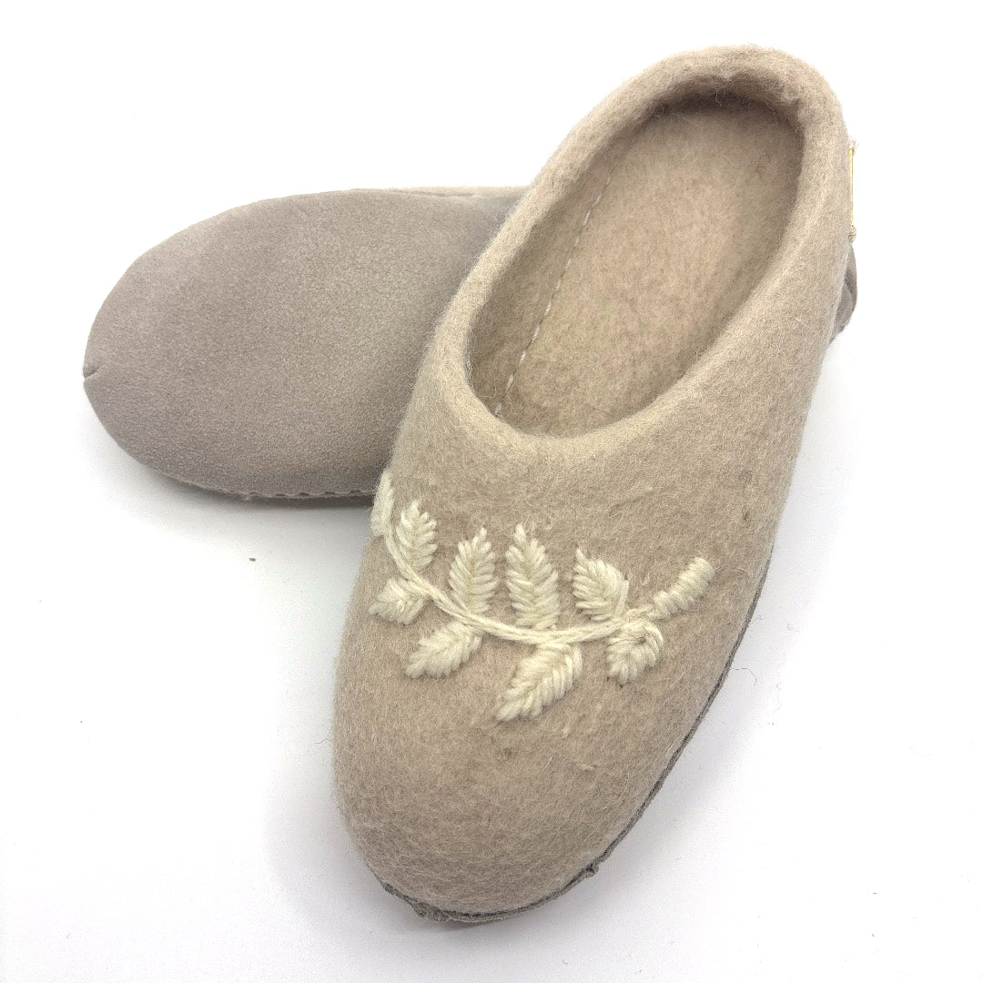 Hand-felted and made from 100% lambswool, these soft open heel slippers are paired with a rugged leather sole for indoor slip resistance and long-lasting comfort. They feature hand-embroidered uppers made with wool yarn that create an organic texture and unique style. Beyond being warm, breathable and easy to get on, the all wool construction makes them naturally anti-microbial which means they will resist building up any kind of smell even after being worn barefoot for years.